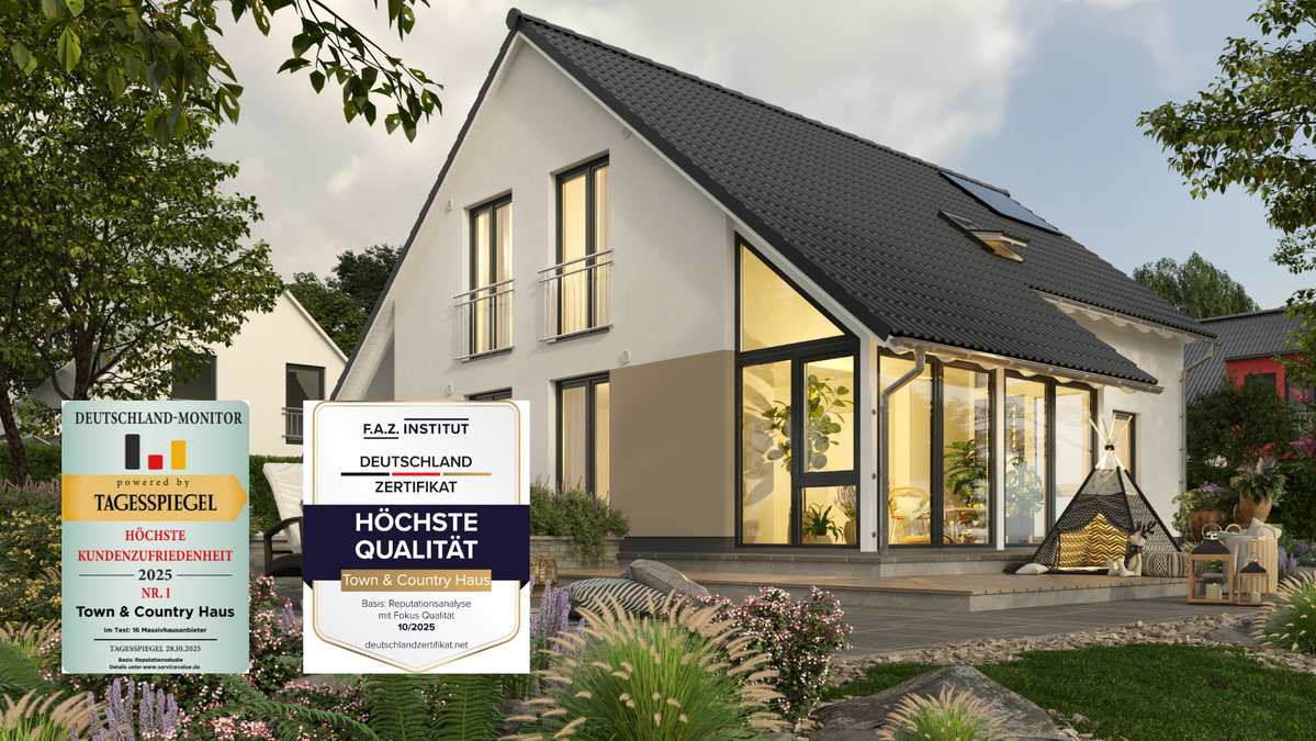 Mit der Auszeichnung „Transparenz 2025“, vergeben vom F.A.Z.-Institut in Kooperation mit ServiceValue, wird schließlich die Offenheit und Klarheit im Unternehmens- und Bauprozess hervorgehoben. Bewertet wurde, wie verständlich Unternehmen über Preise, Leistungen, Abläufe und Werte kommunizieren und wie transparent der Dialog mit Kunden gestaltet ist. Vom ersten Beratungsgespräch bis zur Schlüsselübergabe. Die Anerkennung bestätigt, dass Town & Country Haus nicht nur solide Bauqualität bietet, sondern auch durch klare Kommunikation und nachvollziehbare Prozesse überzeugt.